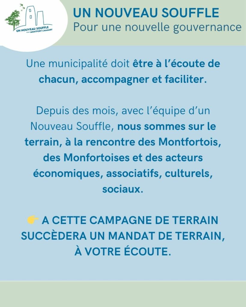 Un Nouveau Souffle pour Montfort l’Amaury, c’est un nouveau souffle pour une municipalité à l’écoute de chacun, transparente et équitable au service de tous les Montfortois !